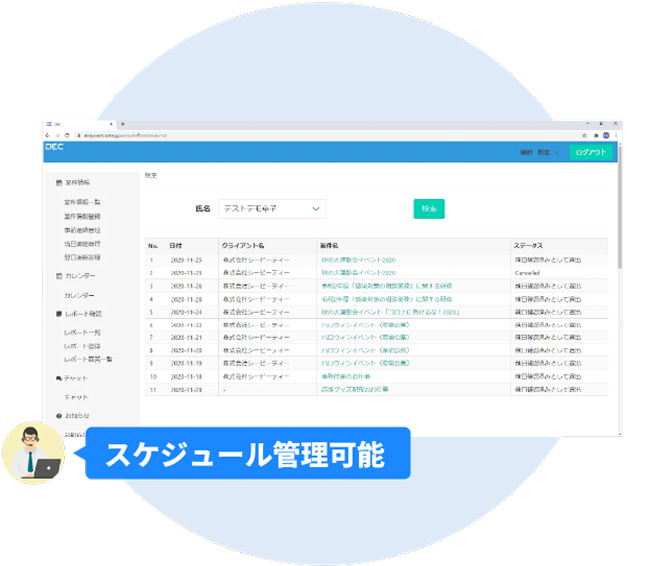 プロキャス警備導入前は全てのコミュニケーションをメール電話ベースで行っており手間がかかっていた。導入後は前日出発・到着確認の連絡を待つリードタイムの削減、空きスケジュール確認、決定事項の連絡工数の削減を実現している。