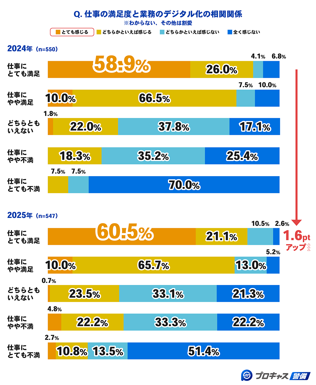 昨年は「警備員の仕事にとても満足」と回答した人のうち、業務のデジタル化が進んでいると「とても感じる」人は58.9%でした。これに対し、今年は60.5%で1.6ポイント増加したことがわかります。