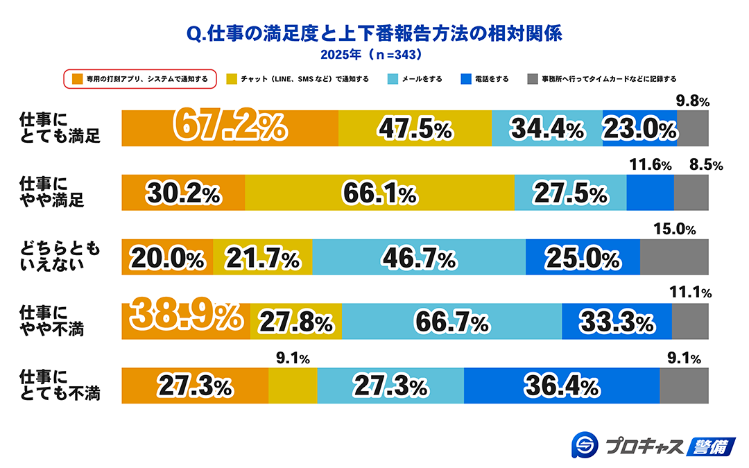 現在も警備員として勤務している人の仕事の満足度と上下番報告方法の相対関係を調べた結果、仕事に「とても満足」と回答した67.2%の人が「専用の打刻アプリ・システム」を利用していることが分かりました。しかし、次に多いのが38.9%で「やや不満」と回答した人であり、仕事の満足度が勤怠方法の利便性だけに比例しているわけではないことも明らかになりました。