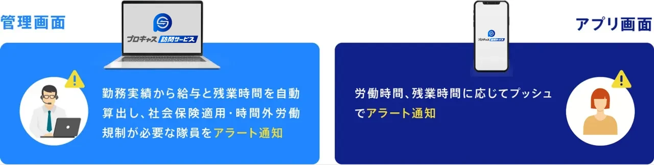 プロキャス訪問サービスでは、下記に対してアラート機能をはじめとした、労働時間を適切に管理し、効率化させることができます。